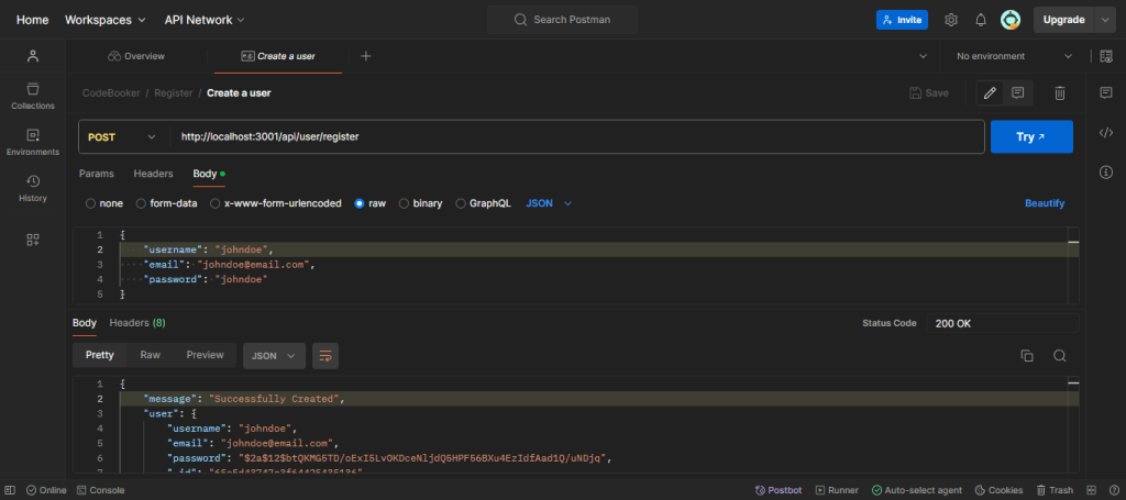When testing the endpoint to fetch a user’s profile, the response I obtained was a server error, even though I correctly sent the email in the request body.