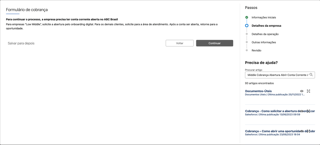 Proactively, the UX Design team at Banco ABC Brasil analyzed the scenario and determined that displaying links to the articles on the screen related to the subject would provide the best experience. As it was a completely new solution, we held meetings with product owners and Salesforce developers to assess its technical feasibility. After receiving approval from the respective areas, the project was developed and adopted in other flows.